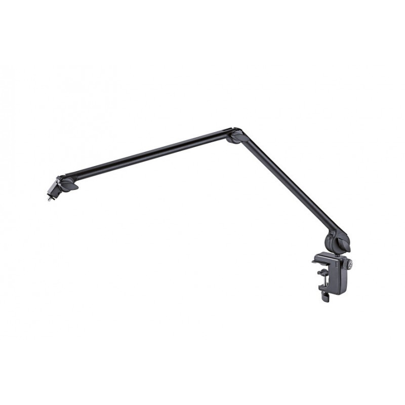 Stolní mikrofonní rameno se závitem 3/8" nebo 5/8" s atraktivním designem pro zvuková studia a multimediální pracoviště. Vhodné pro mikrofony do 1,5 kg. Upínací rozsah svěrky 10 až 51 mm / ø 15 až ø 51 mm. Kovová konstrukce s plastovými vložkami a protiskluzovými podložkami. Lze připevnit na hladké povrchy i trubky. Mikrofonní rameno může být uchyceno do stolního montážního držáku 23855 (není součástí dodávky). Součástí balení jsou 4 kabelové svorky. Prodloužená záruka 5 let.