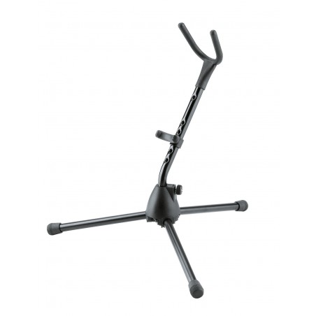 Běžná cena 935 Kč. Nastavitelný skládací stojan pro zahnutý soprán saxofon. Výška 485 mm. Plastová základna vyztužená skelnými vlákny. Flexibilní horní nosné rameno pro různé velikosti korpusů. Stojan je potažený plastovou vrstvou chránící nástroj před poškrábáním. Vyrábí se v černé barvě.