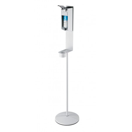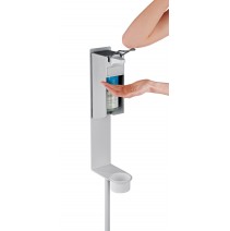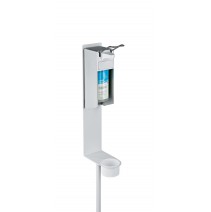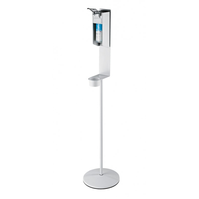 Původní cena 1 615 Kč. Stojan na dezinfekci pro EURO dávkovač. Ocelový stojan má kulatý podstavec o průměru 275 mm zespoda vybavený ochrannou gumovou podložkou. Plastový odkapávací kelímek je umístěn ve výšce 820 mm a lze odejmout a snadno vyčistit. Stabilní držák dávkovače vyrobený z kovu potaženého práškem se hygienicky snadno čistí a je vybaven dvěma různými vzory vrtání. Lze připevnit EURO zásobníky na 350/500 ml a 1000 ml. Upozorňujeme, že stojan není lékařsky certifikovaným produktem. Dezinfekční prostředek není součástí dodávky. Vyrábí se v bílé barvě.