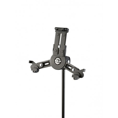 Univerzální držák na tablety menších velikostí. Díky 3/8" závitu lze připevnit rychle a jednoduše k jakémukoliv mikrofonnímu stojanu. Individuálně nastavitelná opěrná ramena umožňují použití tablet s výškou 102/189 mm a šířkou 163/242 mm Hloubka tabletu 6/11 mm. Nastavení náklonu, horizontální i vertikální polohy. Tablet využijete na jevišti, ve zkušebně i doma. Vyrábí se v černé barvě.