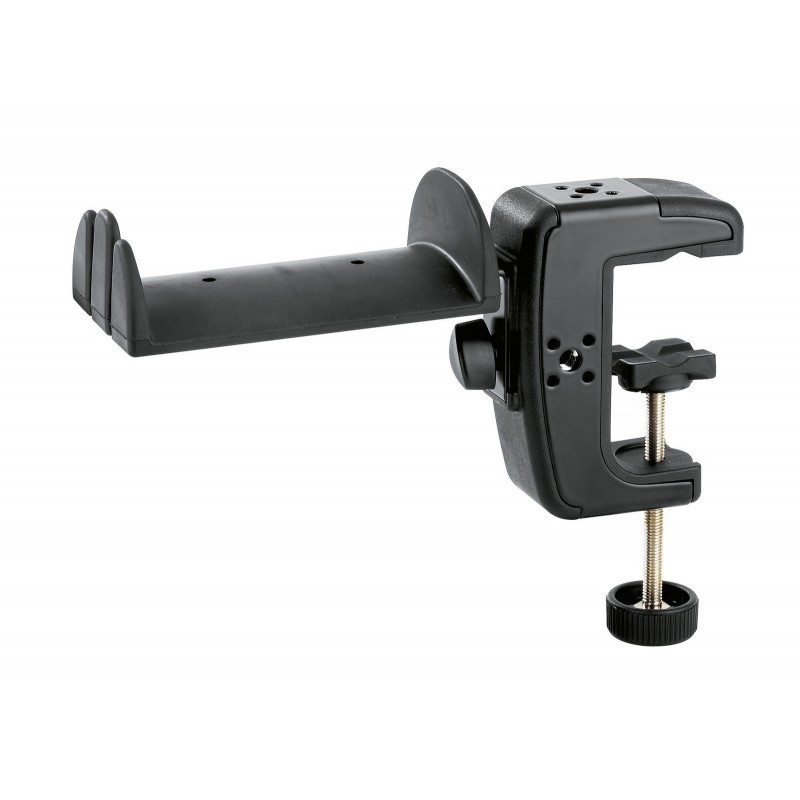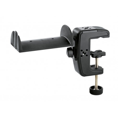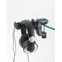 Držák na sluchátka se svorkou pro připevnění ke stolu nebo mikrofonnímu stojanu. Upínací rozsah svorky 0-48 mm. Držák lze otáčet o 90°. Pogumovaný povrch, možnost zavěšení 2 ks standardních sluchátek a 2 ks In-Ear sluchátek. Šířka držáku 100 mm, hloubka 60 mm. Vyrábí se v černé barvě. Prodloužená záruka 5 let.
