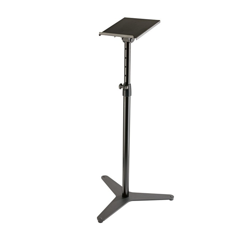 Stabilní ocelový stojan pro studiové monitory s trojnohým podstavcem a naklápěcí nosnou deskou. Podstavec je opatřený plstěnými podložkami pro filtraci hluku. Plocha pro monitor je polohovatelná s možností naklonění o 12,5°. Hloubka desky 45 mm. Postupné nastavení výšky pomocí upínací páky po intervalech 50 mm do 10-ti pozic. Výška stojanu 800/1300 mm. Nosnost 35 kg. Vyrábí se v černé barvě. Prodloužená záruka 5 let.