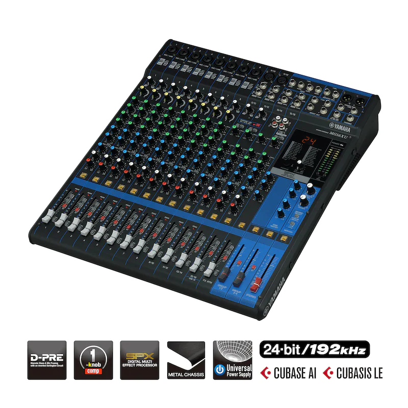 MG 16 XU je vybaven dvanácti kombinovanými mikrofonními Jack 6.3 mm/XLR vstupy s fantomovým +48V napájením . K dispozici jsou pak ještě čtyři linkové stereo vstupy, 4x Aux Send výstup, Monitor Out a stereo výstup s XLR a Jack konektory, které doplňuje ještě čtveřice skupinových sběrnic. Mikrofonní předzesilovače D-PRE s Darlington obvodem zajišťují čistý zvuk a PAD a High Pass Filter přepínače u všech mono vstupů nabídnou rychlou úpravu úrovně vstupního signálu. Na vstupech je osazen třípásmový ekvalizér a kompresor (u mikrofonních vstupů) . Efektová jednotka nabízí celkem 24 různých efektů, kromě široké nabídky reverbů a delayů lze volit i méně obvyklé úpravy zvuku. Samozřejmostí je také sluchátkový výstup pro okamžitý monitoring.